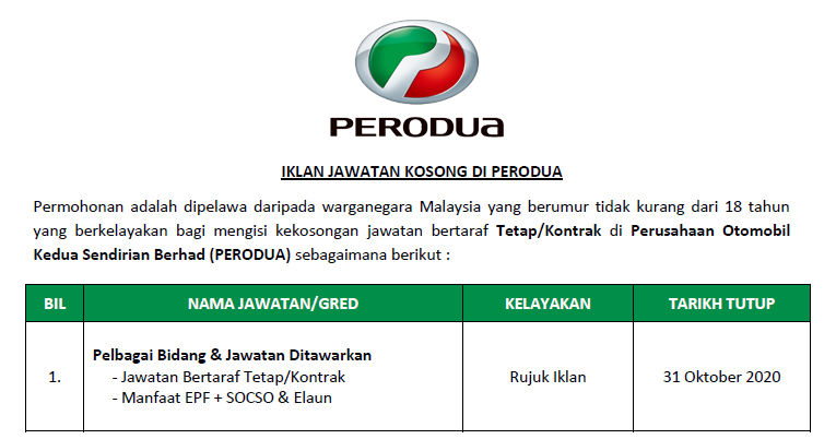 Permohonan adalah dipelawa daripada warganegara Malaysia yang berumur tidak kurang daripada 18 tahun ke atas pada tarikh tutup iklan jawatan dan berkelayakan bagi mengisi kekosongan jawatan di PERODUA sebagaimaana berikut:-