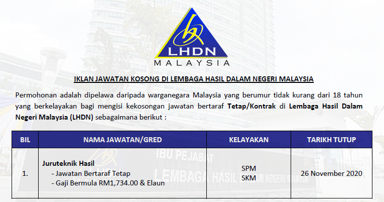 Permohonan adalah dipelawa daripada warganegara Malaysia yang berumur tidak kurang daripada 18 tahun ke atas pada tarikh tutup iklan jawatan dan berkelayakan bagi mengisi kekosongan jawatan di Lembaga Hasil Dalam Negeri Malaysia sebagaimaana berikut:-