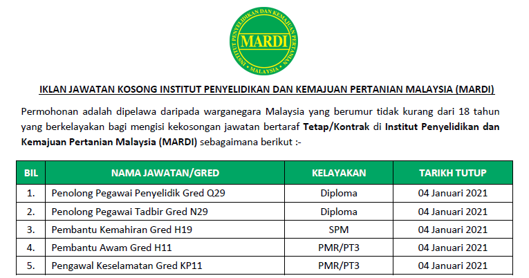 Permohonan adalah dipelawa daripada warganegara Malaysia yang berumur tidak kurang daripada 18 tahun ke atas pada tarikh tutup iklan jawatan dan berkelayakan bagi mengisi kekosongan jawatan di MARDI sebagaimaana berikut:-