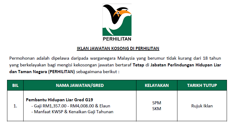 Permohonan adalah dipelawa daripada warganegara Malaysia yang berumur tidak kurang daripada 18 tahun ke atas pada tarikh tutup iklan jawatan dan berkelayakan bagi mengisi kekosongan jawatan di PERHILITAN sebagaimana berikut:-