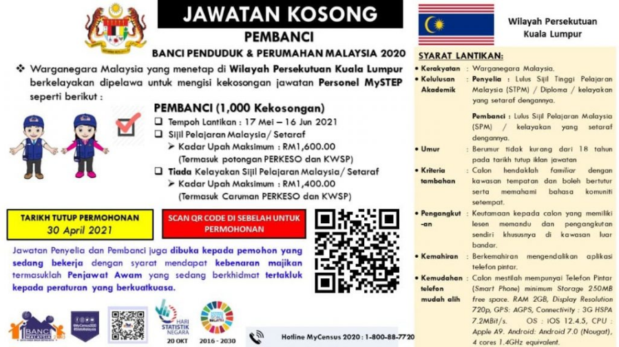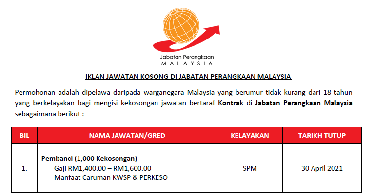 Permohonan adalah dipelawa daripada warganegara Malaysia yang berumur tidak kurang daripada 18 tahun ke atas pada tarikh tutup iklan jawatan dan berkelayakan bagi mengisi kekosongan jawatan di Jabatan Perangkaan Malaysia sebagaimana berikut:-