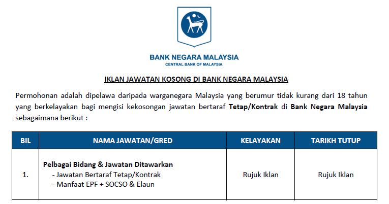 Permohonan adalah dipelawa daripada warganegara Malaysia yang berumur tidak kurang daripada 18 tahun ke atas pada tarikh tutup iklan jawatan dan berkelayakan bagi mengisi kekosongan jawatan di Bank Negara Malaysia sebagaimana berikut:-