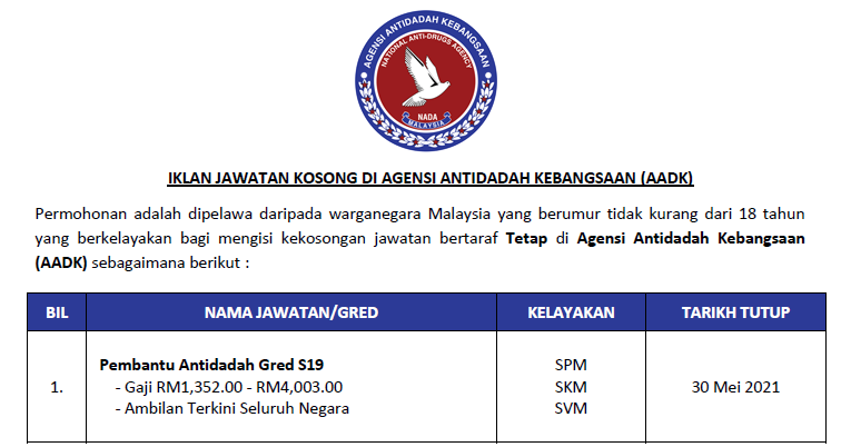 Permohonan adalah dipelawa daripada warganegara Malaysia yang berumur tidak kurang daripada 18 tahun ke atas pada tarikh tutup iklan jawatan dan berkelayakan bagi mengisi kekosongan jawatan di AADK sebagaimana berikut:-