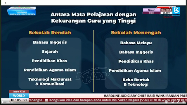 Dalam sidang media berkenaan juga dimaklumkan antara mata pelajaran dengan kekurangan guru tertinggi adalah seperti berikut:
