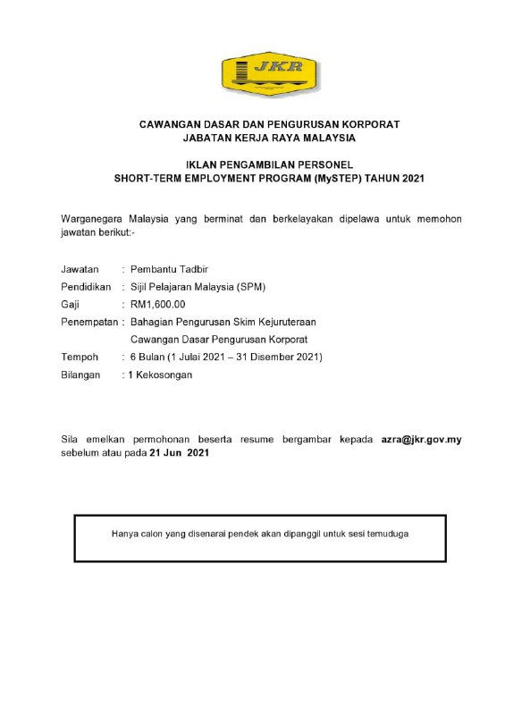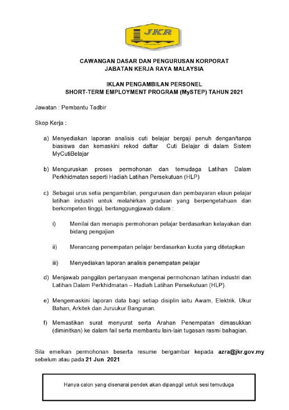 - Tarikh Tutup Permohonan : 21 Jun 2021 (Isnin)