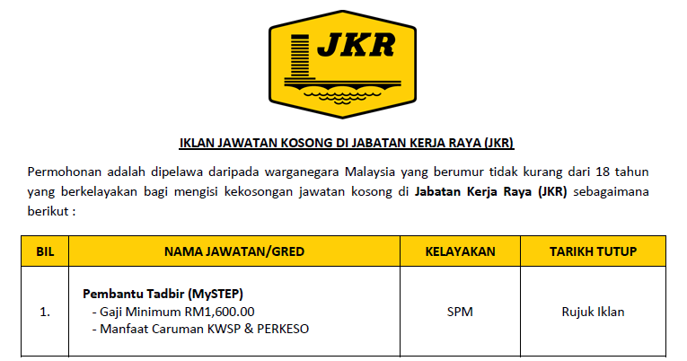 Permohonan adalah dipelawa daripada warganegara Malaysia yang berumur tidak kurang daripada 18 tahun ke atas pada tarikh tutup iklan jawatan dan berkelayakan bagi mengisi kekosongan jawatan di JKR sebagaimana berikut:-