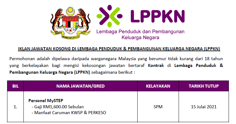 Permohonan adalah dipelawa daripada warganegara Malaysia yang berumur tidak kurang daripada 18 tahun ke atas pada tarikh tutup iklan jawatan dan berkelayakan bagi mengisi kekosongan jawatan di LPPKN sebagaimana berikut:-
