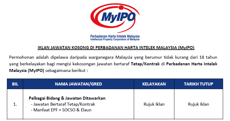 Permohonan adalah dipelawa daripada warganegara Malaysia yang berumur tidak kurang daripada 18 tahun ke atas pada tarikh tutup iklan jawatan dan berkelayakan bagi mengisi jawatan kosong di MyIPO sebagaimana berikut:-