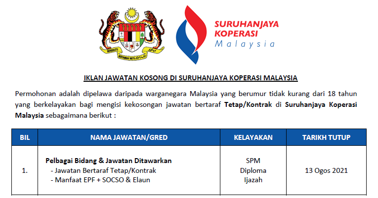 Permohonan adalah dipelawa daripada warganegara Malaysia yang berumur tidak kurang daripada 18 tahun ke atas pada tarikh tutup iklan jawatan dan berkelayakan bagi mengisi jawatan kosong di Suruhanjaya Koperasi Malaysia sebagaimana berikut:-