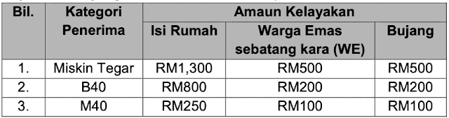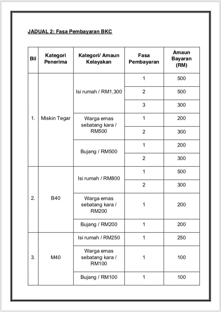 Bagi pembayaran Fasa 1 ini, di bawah kategori miskin tegar dan B40, isi rumah akan mendapat sebanyak RM500, manakala warga emas sebatang kara dan bujang pula RM200.