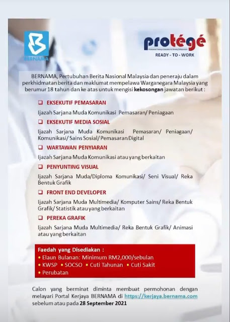 Permohonan adalah dipelawa daripada warganegara Malaysia yang berumur tidak kurang daripada 18 tahun ke atas pada tarikh tutup iklan jawatan dan berkelayakan bagi mengisi kekosongan jawatan di BERNAMA sebagaimana berikut:-
