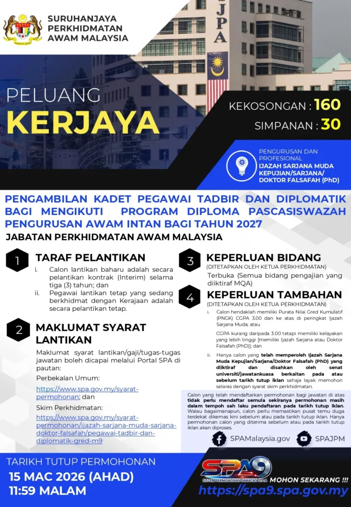 Berita baik bagi mereka yang sedang mencari peluang pekerjaan. Suruhanjaya Perkhidmatan Awam kini membuka peluang kerjaya dengan mengumumkan Pengambilan Kadet Pegawai Tadbir dan Diplomatik bagi mengikuti Program Diploma Pascasiswazah Pengurusan Awam Intan untuk Tahun 2027 yang menanti individu yang berkelayakan. Berikut dikongsikan maklumat Peluang kerjaya sebagai Pegawai PTD SPA bagi tahun 2027