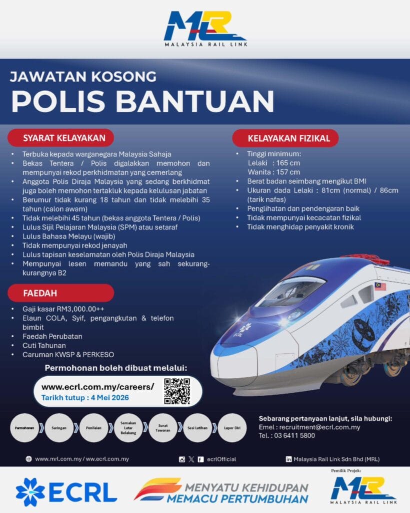 Berita baik bagi mereka yang sedang mencari peluang pekerjaan. Malaysia Rail Link Sdn Bhd (MRLSB) kini membuka peluang kerjaya sebagai Polis Bantuan yang menanti individu yang berkelayakan untuk memohon. Berikut dikongsikan maklumat Jawatan Kosong Polis Bantuan ECRL 2026 terkini.