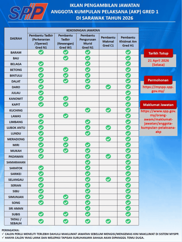 Permohonan adalah dipelawa daripada warganegara Malaysia yang berumur tidak kurang daripada 18 tahun ke atas pada tarikh tutup iklan jawatan dan berkelayakan bagi mengisi Pengambilan AKP SPP Sarawak 2026 sebagaimana berikut: